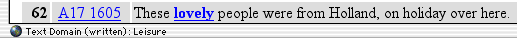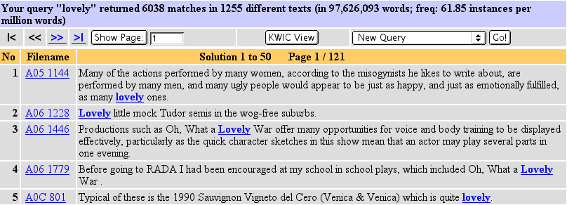 When you have made a Standard query or a Lemma query the results are shown in the BNC Query result. Above the concordance lines is a search result bar and row containing the navigation elements. By default, query results are displayed as shown in the following screenshot, i.e. one <s>-unit per hit number.