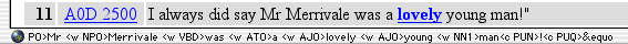 If you move your mouse over the highlighted search word of a solution, the immediate context of this solution is displayed with part-of-speech (POS) tags attached in the status bar of your browser: